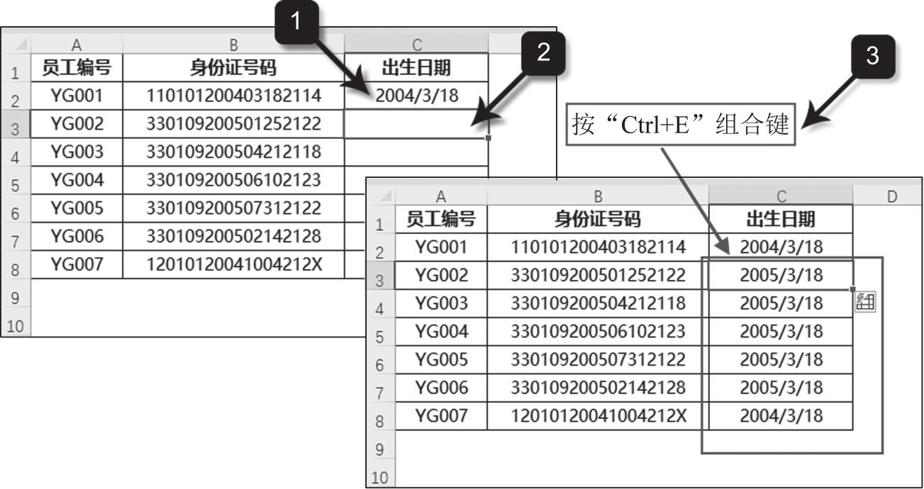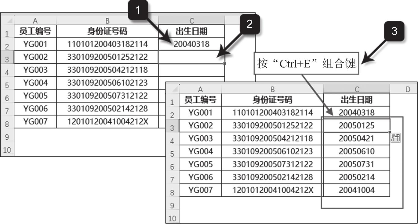 。例如,某企业需要在员工信息表中根据员工的身份证号码快速提取出生日期,如图4-2所示。我们可以通过Excel的快速填充工具来实现这一目的。