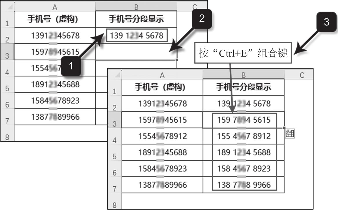 利用Excel的快速填充功能将手机号分3段显示的具体操作步骤如下:按要求在第一行(B2单元格)中输入标杆数据(如“139 1234 5678”),选中B3单元格后按“Ctrl+E”组合键,即可实现手机号的分段显示,如图4-14所示。