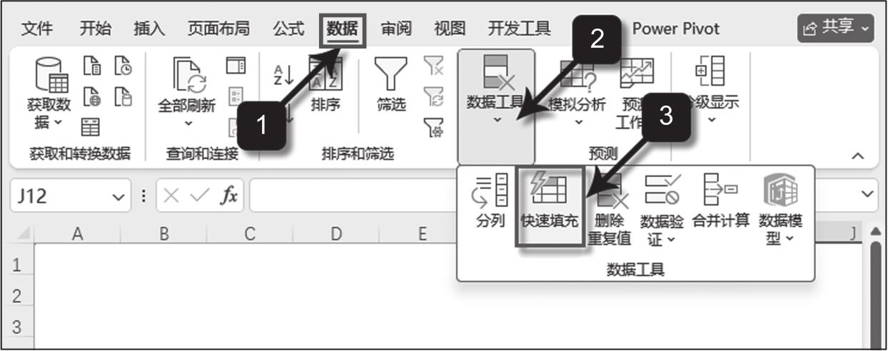 2)菜单按钮:在“数据”选项卡下的“数据工具”组中单击“快速填充”按钮,如图4-1所示。