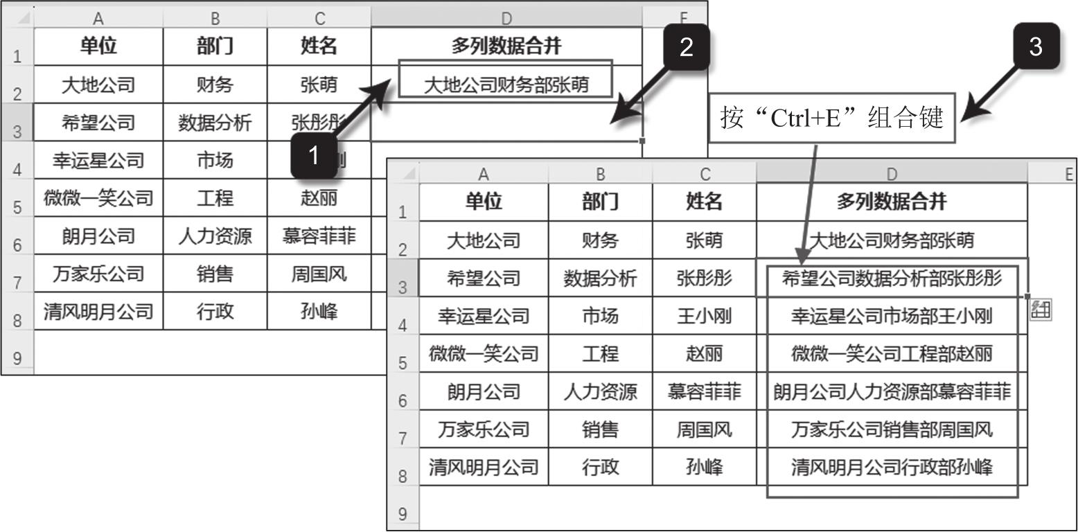 利用Excel的快速填充功能合并多列数据的具体操作步骤如下:先按照要求在第一行(如D2单元格)输入标杆数据(如“大地公司财务部张萌”),然后选中D3单元格,按“Ctrl+E”组合键即可将这3列数据合并,如图4-10所示。