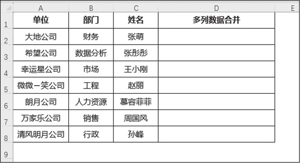 如何快速合并多列数据呢?让我们来看下面这个案例:某企业的联系人单位及部门信息表如图4-9所示,要求将A~C列中的单位、部门、姓名等多列数据合并在一起,并在部门名称(如“财务”)后添加“部”字(如“财务部”)。