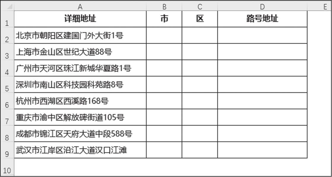 如何从一列数据中按需要提取多种信息呢?让我们来看这个快速提取地址信息的案例:某快递公司系统中导出的收件人详细地址表如图4-11所示,要求将其中的市、区、路号地址分别提取出来并分列放置。