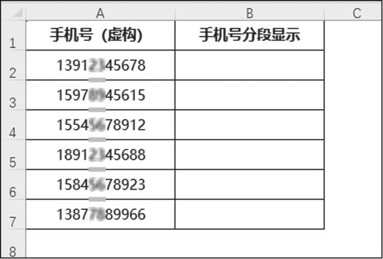 现有一张包含手机号(虚构)的信息表,如图4-13所示,需要将A列的11位手机号数字按照3、4、4的格式分3段显示。