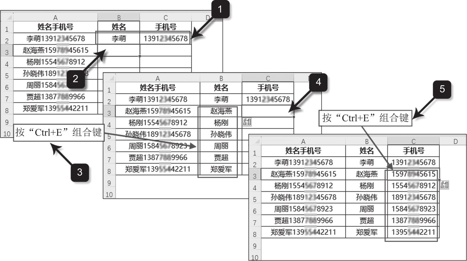 利用Excel的快速填充功能从表格中快速拆分出姓名、手机号的具体操作步骤如下:先手动输入第一行数据作为标杆(B2:C2单元格区域),然后选中B3单元格,按“Ctrl+E”组合键快速填充姓名;再选中C3单元格,按“Ctrl+E”组合键快速填充手机号,如图4-8所示。