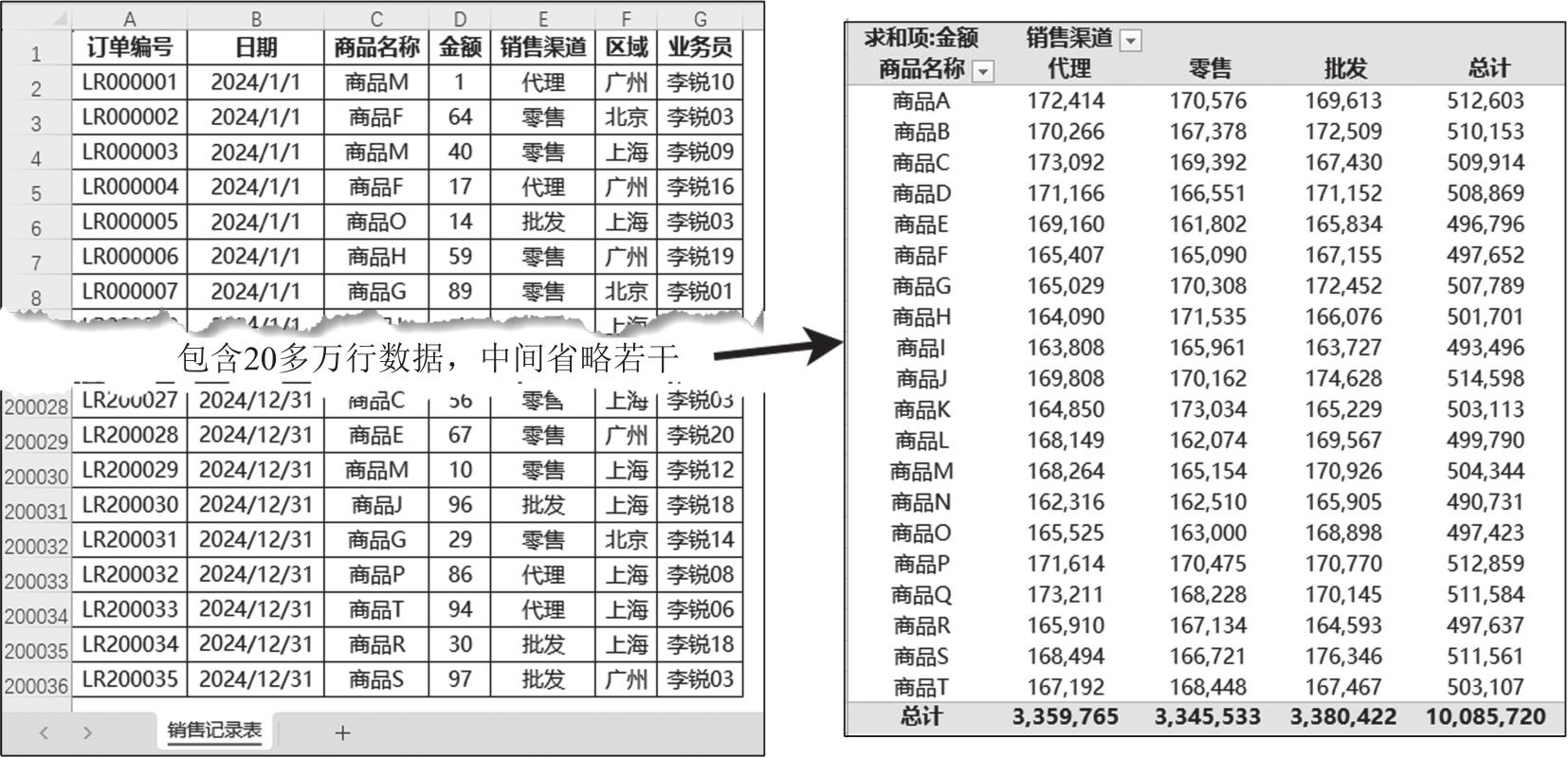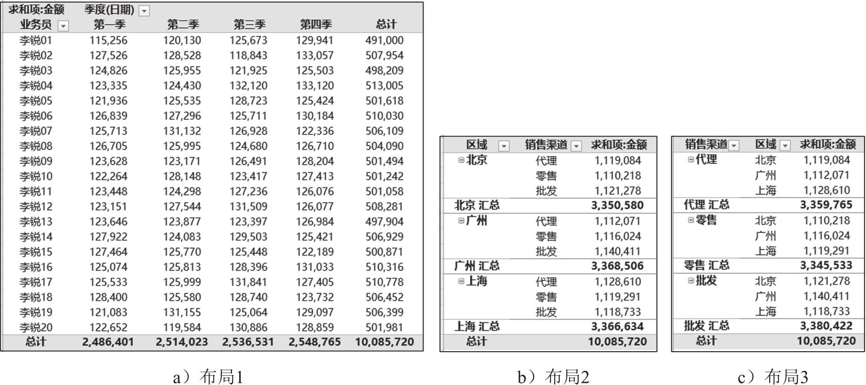 数据透视表能够根据用户需求对报表布局灵活变换,如图1-10所示。数据透视表支持用户从不同角度查看数据,并通过交叉表格分析不同层面的信息。这种灵活性使得用户可以根据需求调整数据的展示方式,从而更直观地理解数据之间的关系。第12章会详细讲解该功能。