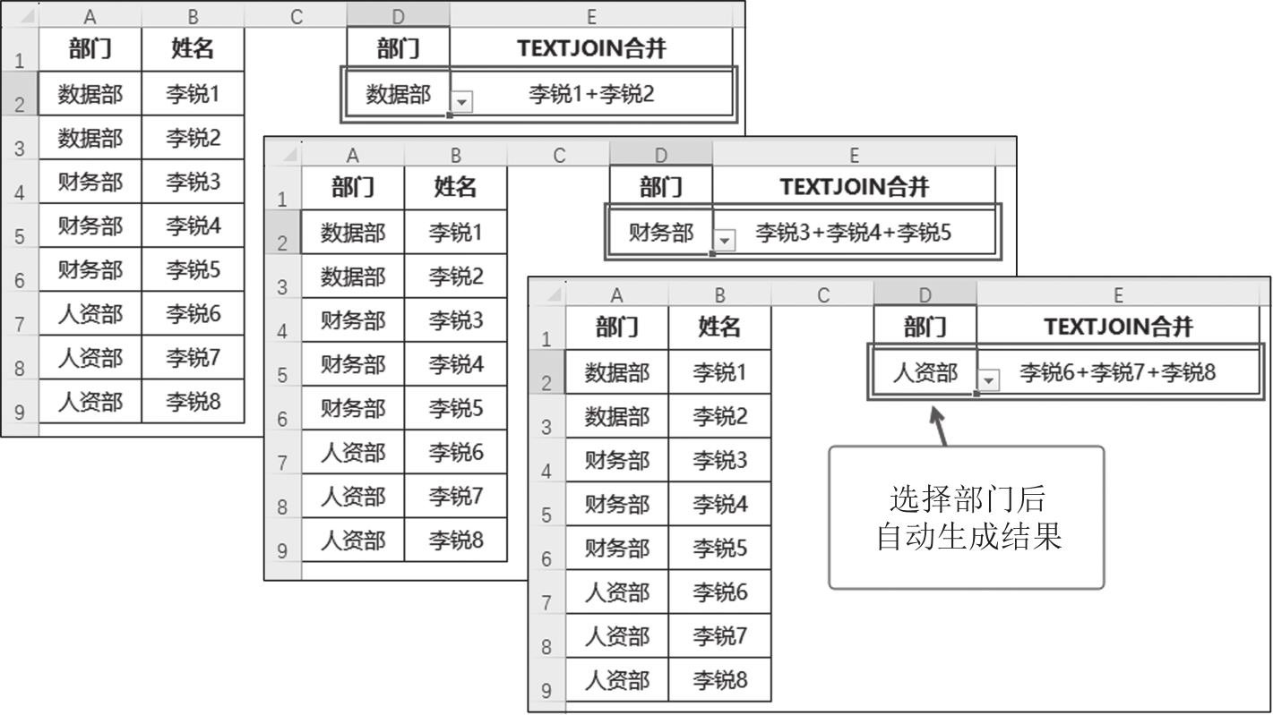 Excel的函数公式可以按条件自动合并同类项(见图1-6),数据源更改后,公式结果支持自动更新。第7章会详细讲解该功能。