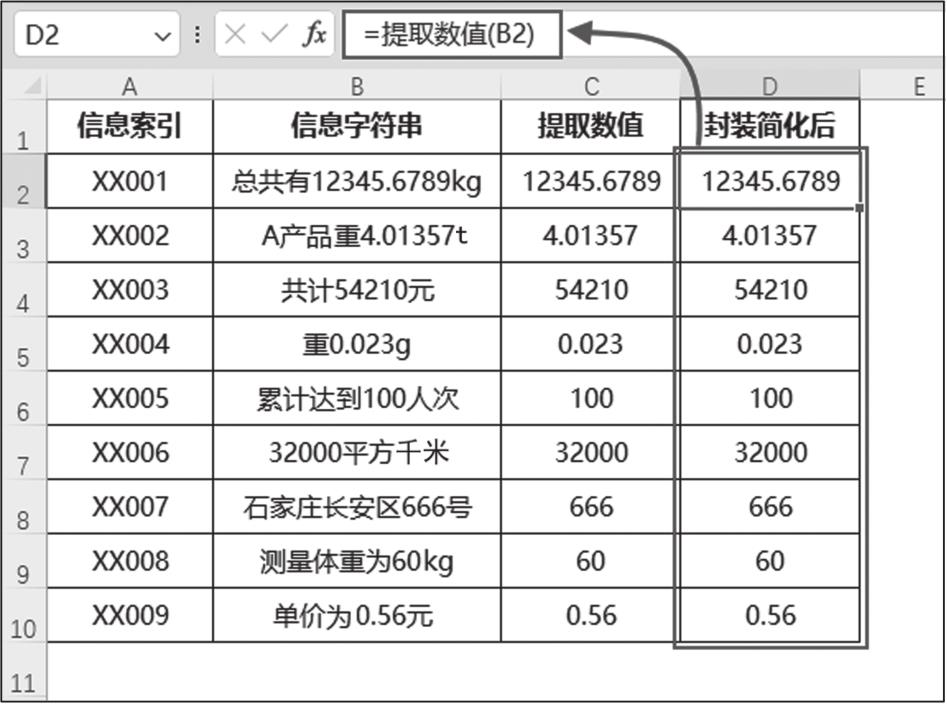 Excel的函数公式允许用户将复杂的计算过程进行封装简化,如图1-5所示。例如,如果需要从字符串中提取数值,原本可能需要使用高级数组公式或编程解决,但是经过封装简化后,用户只需输入公式“=提取数值(B2)”即可轻松解决这一复杂问题。第6章会详细讲解该功能。