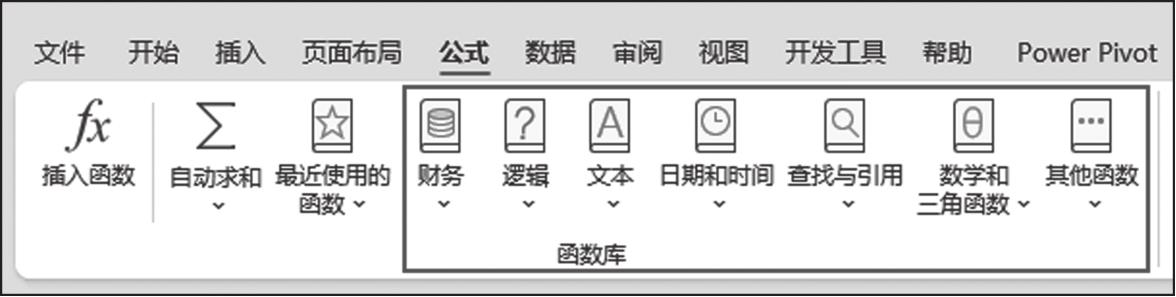 函数公式是Excel中非常强大的功能之一,它提供了丰富的计算、分析和数据处理能力,不但可以满足用户在条件判定、文本处理、日期和时间管理、查找和引用以及统计计算等方面的需求,而且还涵盖了财务、数学和工程等多个领域,为完成各类统计分析和计算任务提供了丰富的工具。Excel函数库在“公式”选项卡下的“函数库”组中,用户可以按照分类选择和调用对应函数,如图1-4所示。
