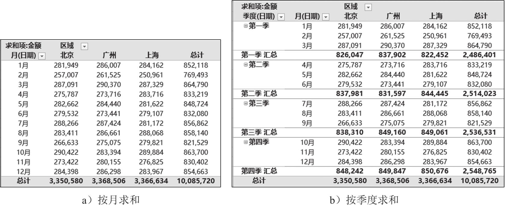 数据透视表具备动态交互统计计算功能,允许用户根据不同的条件和时间维度进行灵活的多维度分析,从而更方便地探索和揭示数据的深层关系,如图1-11所示。第15章会详细讲解该功能。