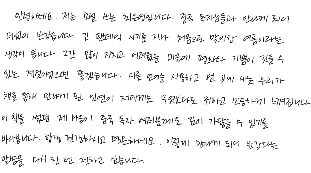 大家好,我是写小说的崔恩荣。能和中国的读者朋友们在此相遇,我非常高兴。漫长的疫情过去以后,这应该是我们迎来的第一个夏天。过去一段时间,所有人都非常辛苦和不易,希望在这个季节,我们的内心都能充满平静与喜悦。我们使用着不同的语言,生活在遥远的异国,但通过书籍相遇、相知,对我来说这是无比珍贵和值得珍惜的缘分。衷心地希望我写作这本书时的心意,也能引发中国读者朋友们的共鸣。最后,祝愿大家都健康、平安。能有此机会在此与大家交流,再次表示感谢! sezaiK+kP+cPRlUls6eJeuXPzSG9U9/NsqY1ZkfSEKDhtCCORJ2g4MdCFIWuT1xD
