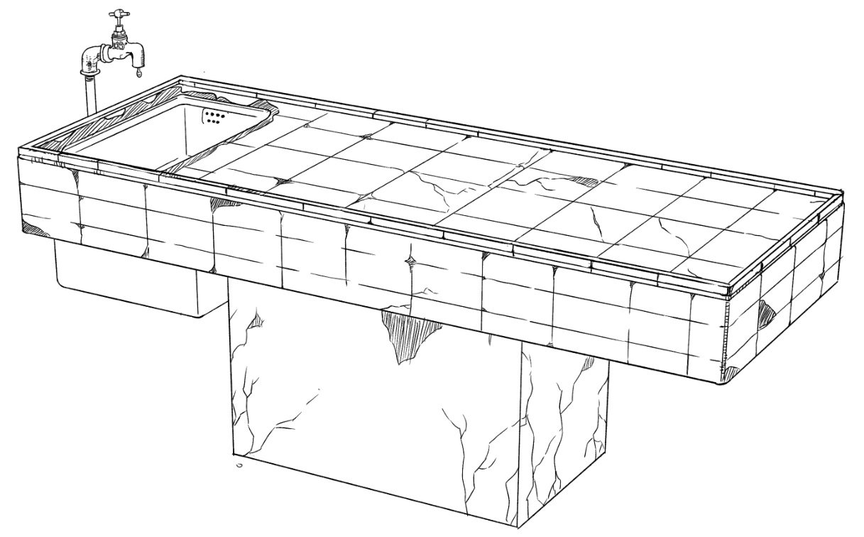 解剖室里原本由砖头砌成、外表贴着瓷砖的解剖台已经不见了,取而代之的是一张崭新的、结构简单的不锈钢解剖台。解剖台的后面,放着一台黑色的工业风扇,估计是起到吹散臭气、给室内降温的作用。