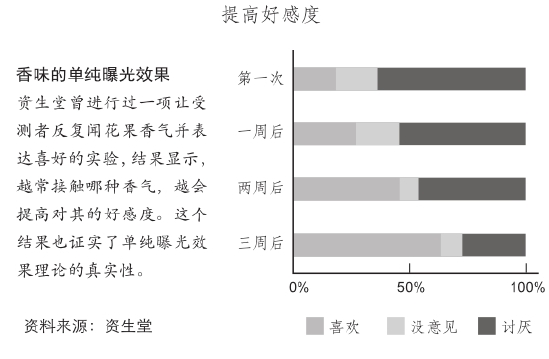 人们对单纯曝光效果也有许多误解。比如,经常出现在意中人面前积极地自我推销,也可能让对方厌烦,造成负面效果。而对于那些我们平常没有特别注意的面孔或标志,由于日常生活中屡次接触,反而容易对其怀有好感,这就是单纯曝光效果。
