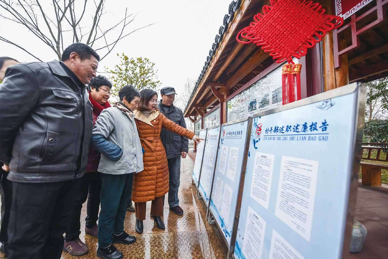 ★ 2019年1月15日,浙江省长兴县虹星桥镇港口村党总支委员(右二)向村民介绍2018年度村干部述职述廉情况,接受村民监督。(新华社记者徐昱摄)