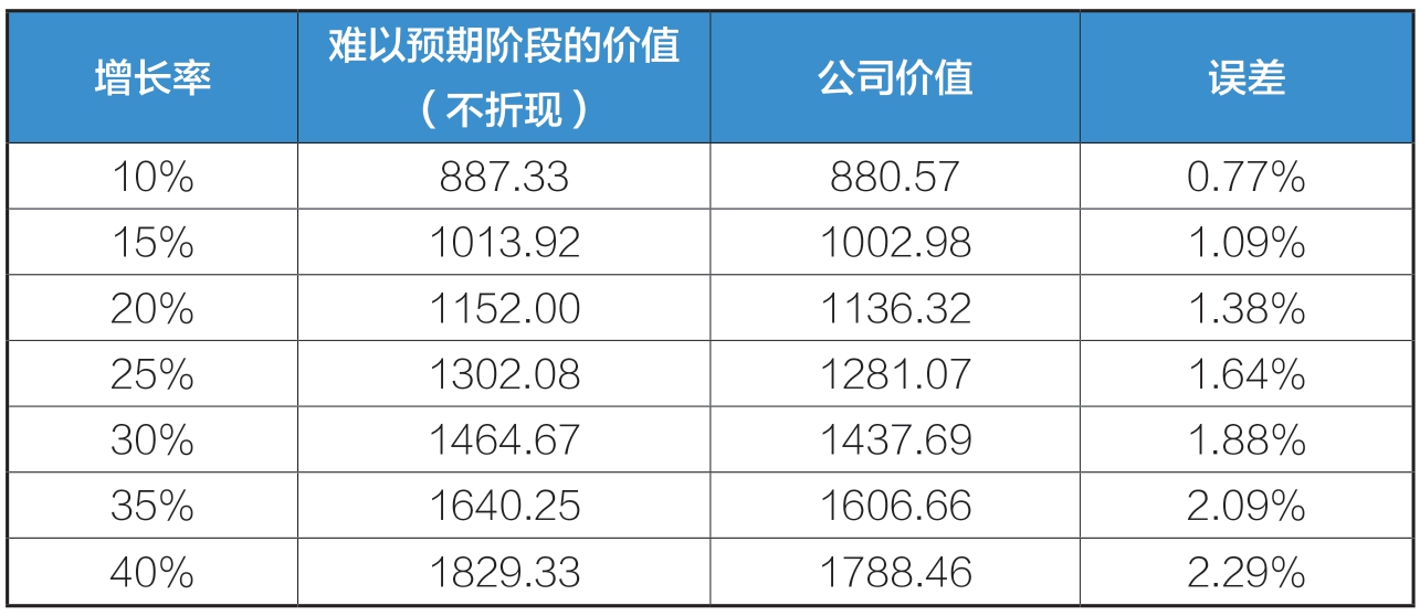 更进一步,我们也可将“公司价值”与“难以预期阶段的价值”列在同一张表中,来计算二者误差,如表4-15所示。