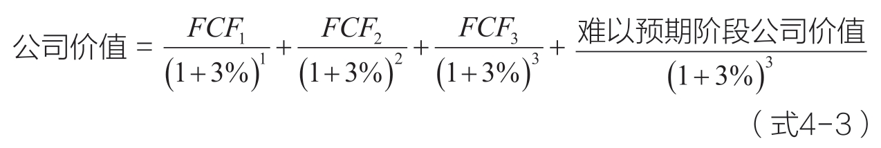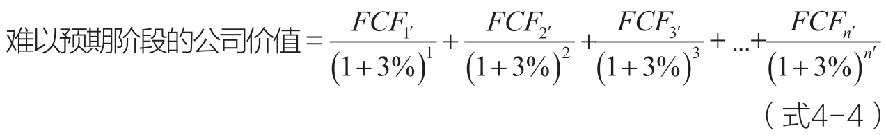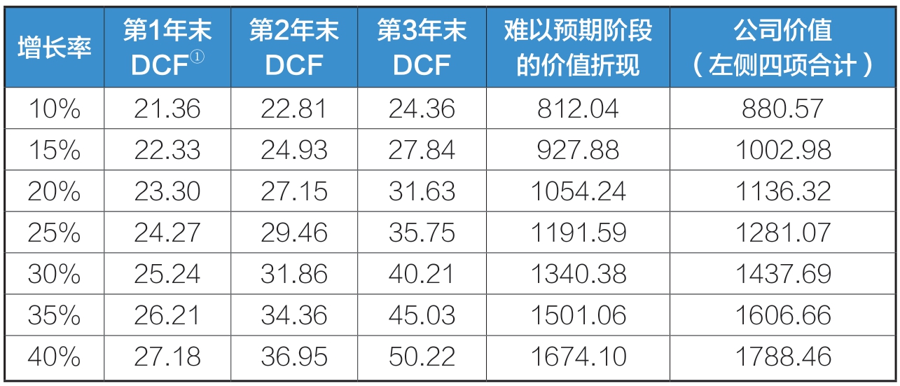 我们知道,表4-14的公司价值中不仅包含了难以预期阶段的价值折现,还包括了第1至第3年末DCF,而表4-13的最后一列仅为难以预期阶段的价值,只是未折现罢了。二者相差无几,意味着难以预期阶段的价值在折现过程中减少的值,被第1至第3年末DCF增加的数值抵销了。该过程也可用更精确的数学过程表达,但考虑到本书不是教科书,就不深究了。