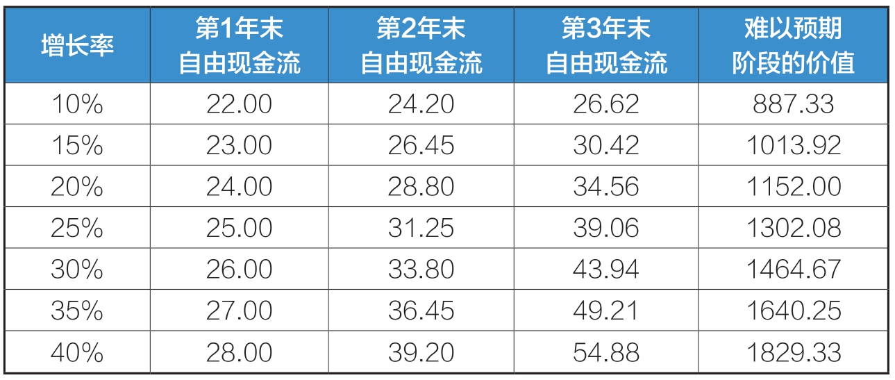在此基础上,为了更具象化地得到公司价值的简易表达式,我们分别列出前三年增长10%至40%(步长为5%)的养鸡场,其前三年自由现金流和难以预期阶段的价值(均为折现),即上式中的FCF1、FCF2、FCF3、FCF3/r0,如表4-13所示。