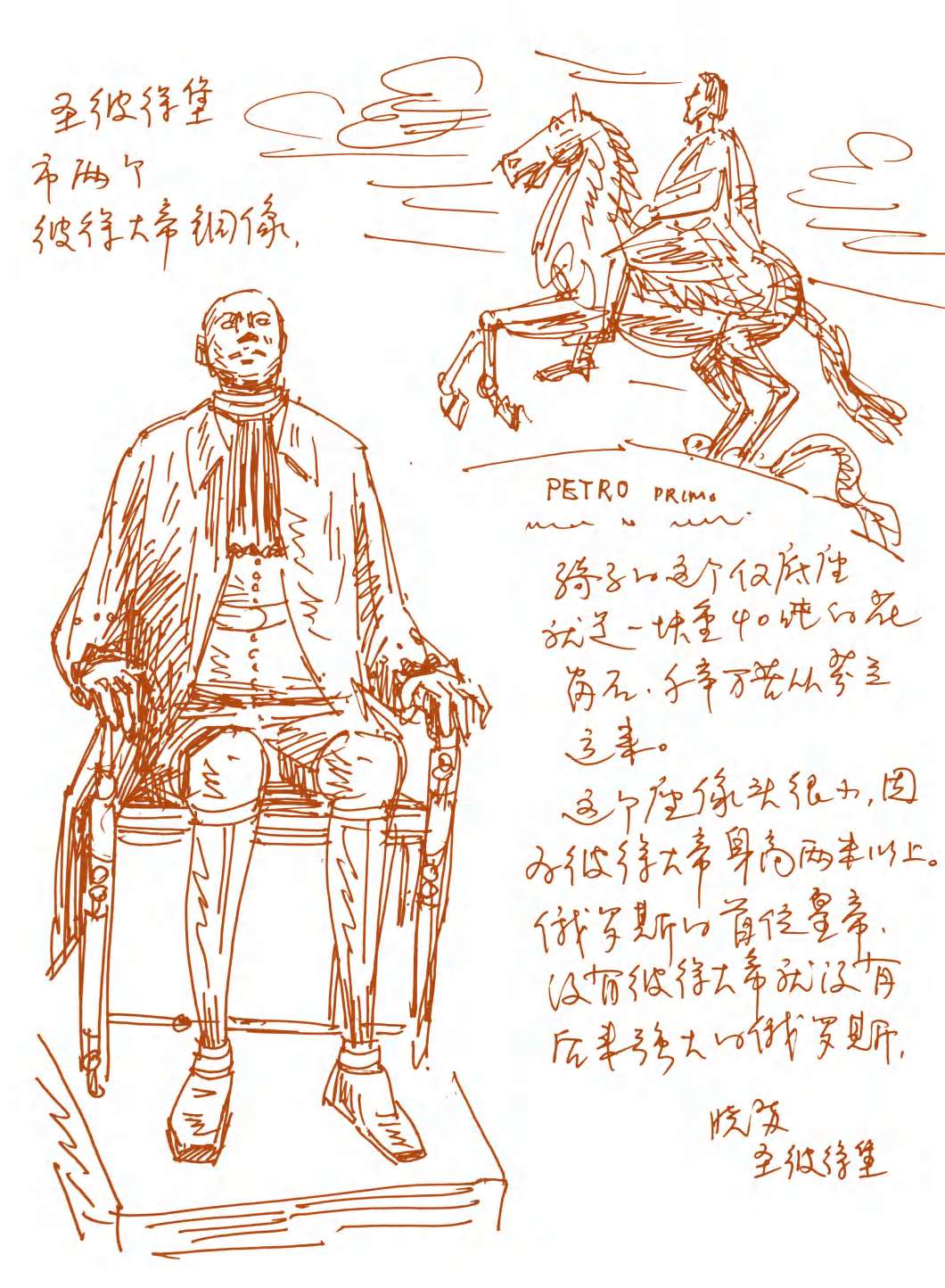没有彼得大帝,就没有圣彼得堡,也不会有今天的俄罗斯,他理所当然地享受世代俄罗斯人的尊崇。骑马这尊像底座是一块重40吨的花岗石,千辛万苦从芬兰运来。另一尊坐像头显得很小,可能是为了体现彼得大帝是一个两米以上的大个子。