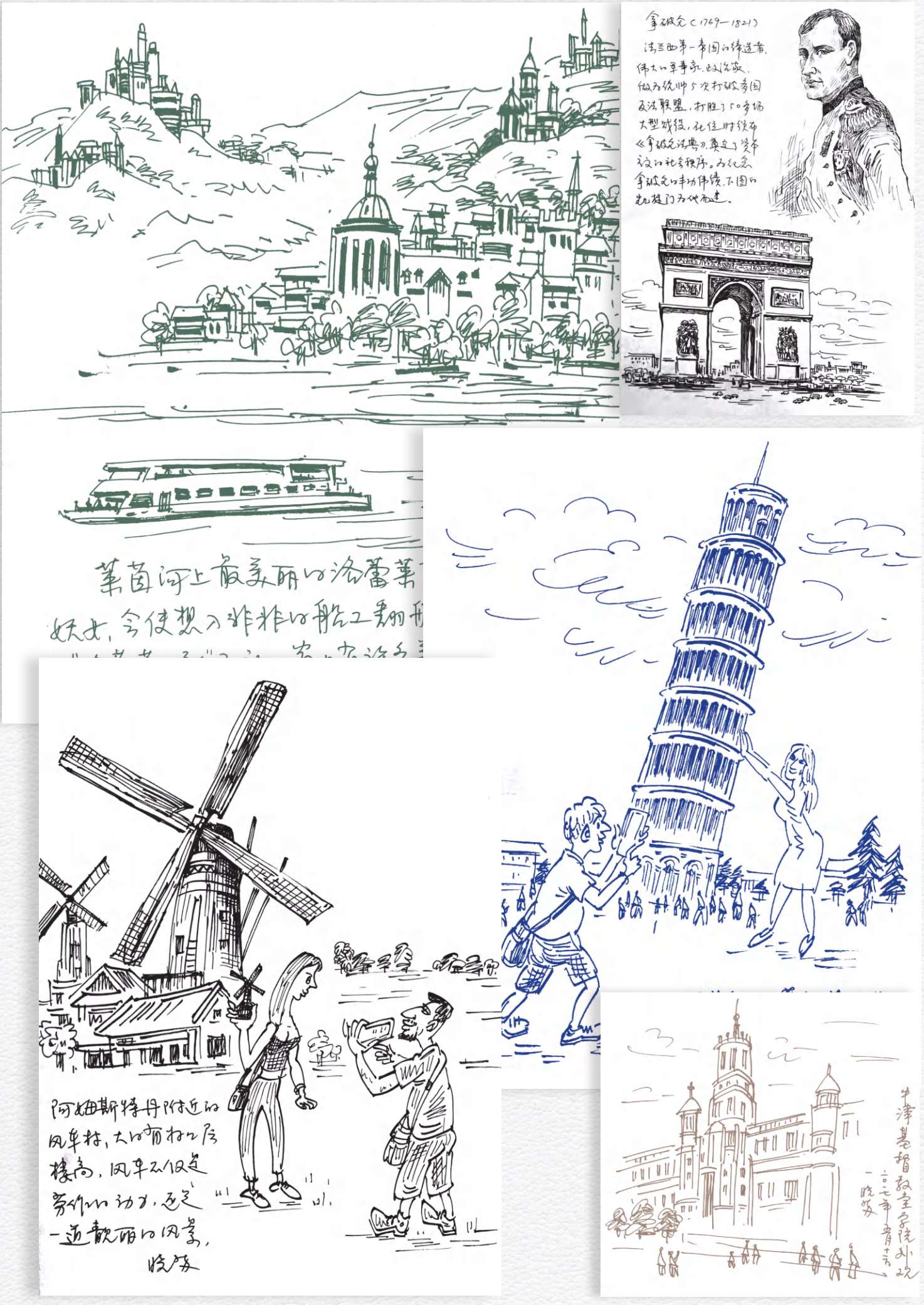 18年前,我为那次西欧游做足了准备,置办新相机,购买移动卡,带上钢笔和速写本。一路上欣赏景色,感悟异域风情,拍摄照片,我还要见缝插针地勾画速写,里面有动感的形象、即时的感知、导游讲解的要点和旅行走向的手绘地图。尤其是在平稳的大巴上,我可以从容地完善、补充这些速写。很快,这个本子被团友们争相传阅,点燃起他们对过往景色的记忆,那些生动活泼的画面,以及人文、历史、地理的碎片丰富了他们对旅途的认知。