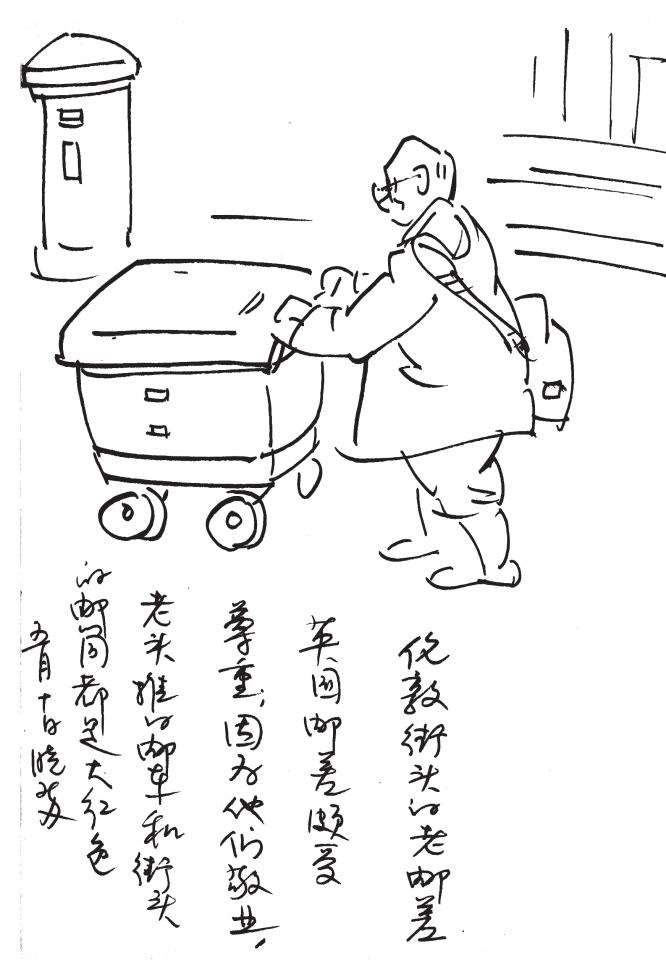英国邮差因为敬业而颇受尊重。老邮差推的邮车和街头的邮筒都是大红色的。在伦敦看到这位老邮差,倍感亲切和感动。