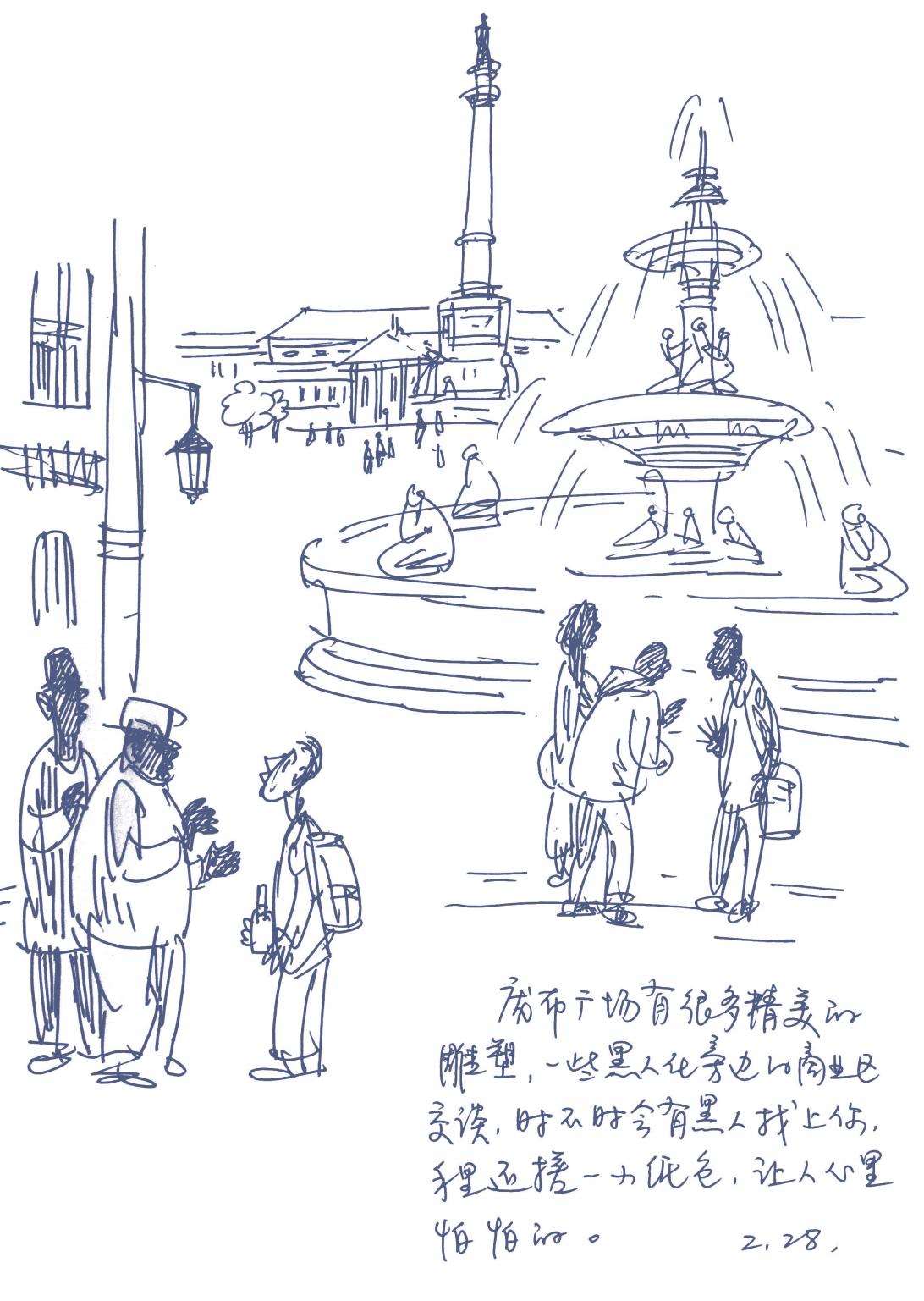 里斯本有许多广场,庞布广场是其中之一。庞布广场有很多精美的雕塑,一些黑人在旁边的商业区交谈,时不时会找上你。当黑人兄弟拿着小纸包向我诉说时,我心里还是有点怕怕的。