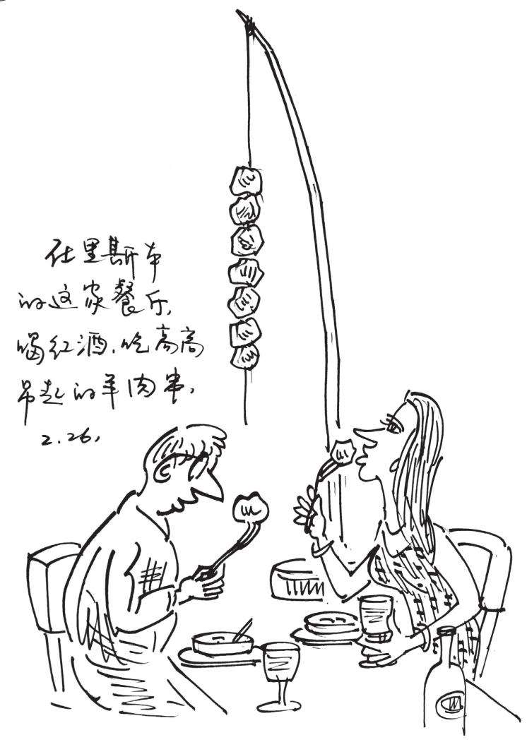 在里斯本的一家餐厅,喝红酒,吃高高吊起的硕大的羊肉串。
