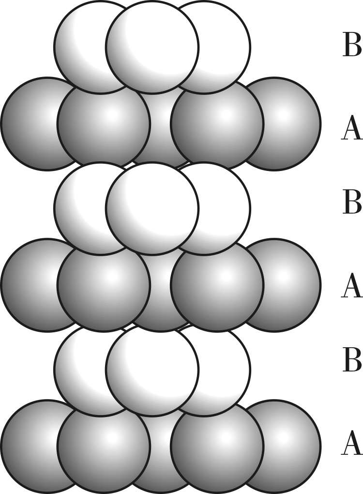 一种是第三层的球体落在未穿透的空隙位置上,从垂直于图面的方向观察,此时第三层球的位置正好与第一层相重复。如果继续堆第四层,则第四层又与第二层重复,而第五层与第三层重复,如此继续下去,每两层重复一次。这种紧密堆积方式称为二层最紧密堆积,用ABAB…的记号表示,如图2-3所示。又由于在这种堆积中,可以找出六方晶胞,其中相当点(球)是按六方格子排列的,所以也称为六方最紧密堆积。