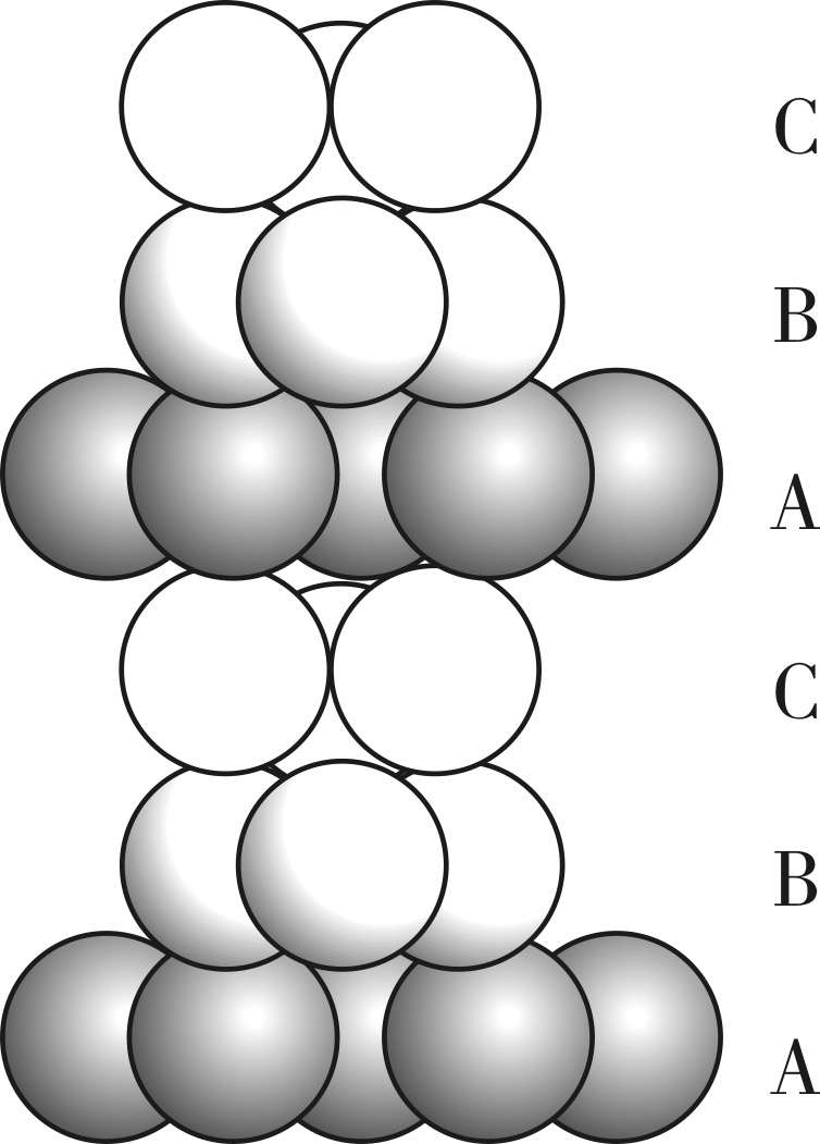 另一种堆积方式是第三层的球体落在连续穿透两层的空隙位置上。这样第三层和第一、二层都不同。叠置的第四层才与第一层重复,第五层与第二层重复,第六层与第三层重复,每三层重复一次。这种紧密堆积方式称为三层最紧密堆积,用ABCABC…的记号表示,如图2-4所示。又由于在这种堆积中,可以找出立方晶胞,其中相当点(球)是按立方面心格子分布,所以也称为立方最紧密堆积。