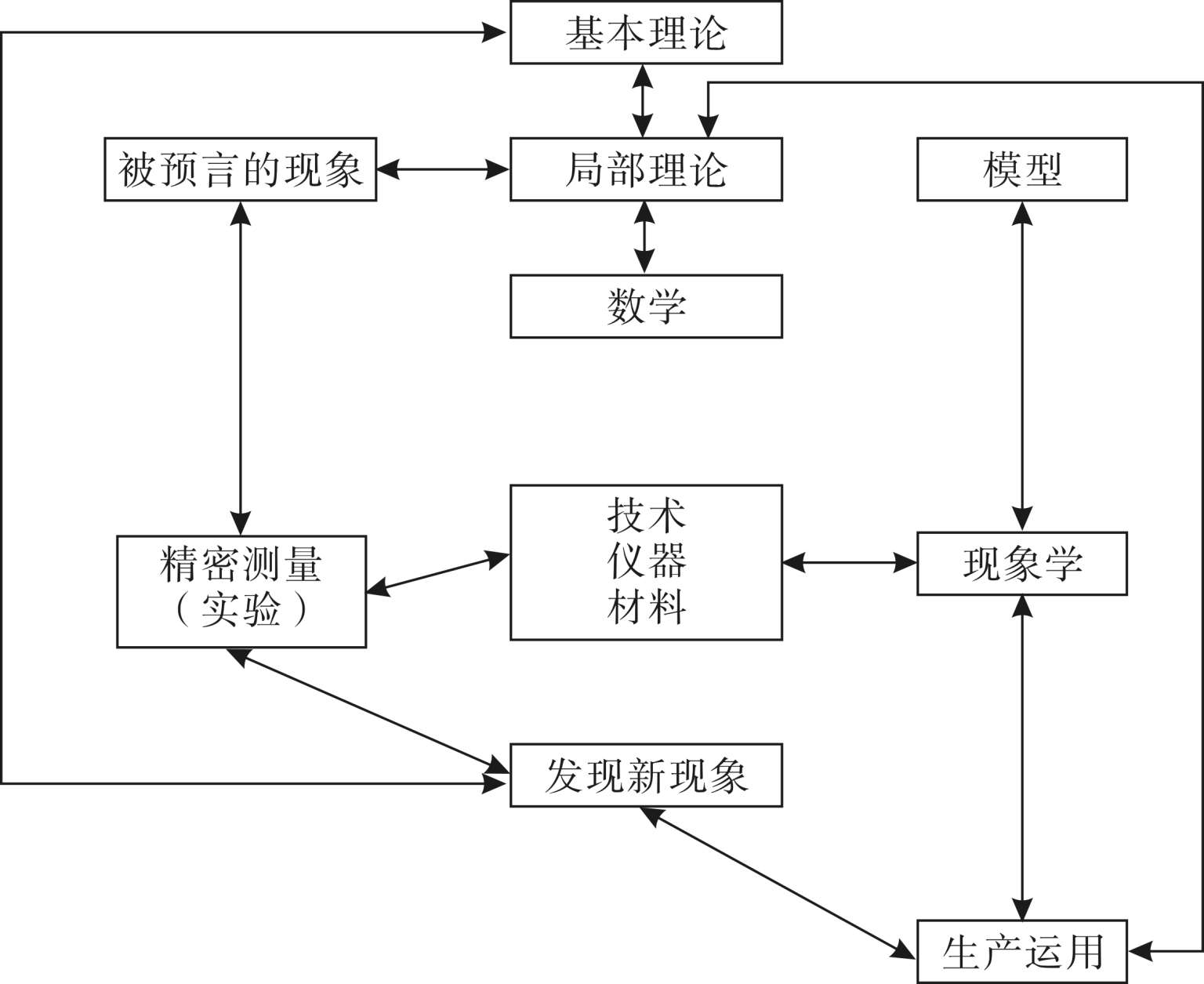 如果我们把这个体系看成是一个活的有机体,每个方框代表这个有机体的一个“器官”,想象一下这个有机体的生存和发展,还是很有趣的。在这个体系中,各个不同的部分互相依存,它们代表着复杂的相互作用系统,并随着时间而进化。如果切除某个“器官”,这个有机体就难以存活下去。对这种比喻性的理解,有助于我们看清物理学的基本研究思路体系的本来面目并加以重视。在理论方面,你也许会想起牛顿、麦克斯韦、爱因斯坦;在实验方面,你也许会想起伽利略、法拉第、卢瑟福;在数学方面,你也许会想起欧几里得、黎曼、希尔伯特。无论你从哪个“器官”想起谁,都会感受到这些科学家在源源不断地通过这些“器官”向这个有机体输送营养,也许未来的你也会是其中的一个。