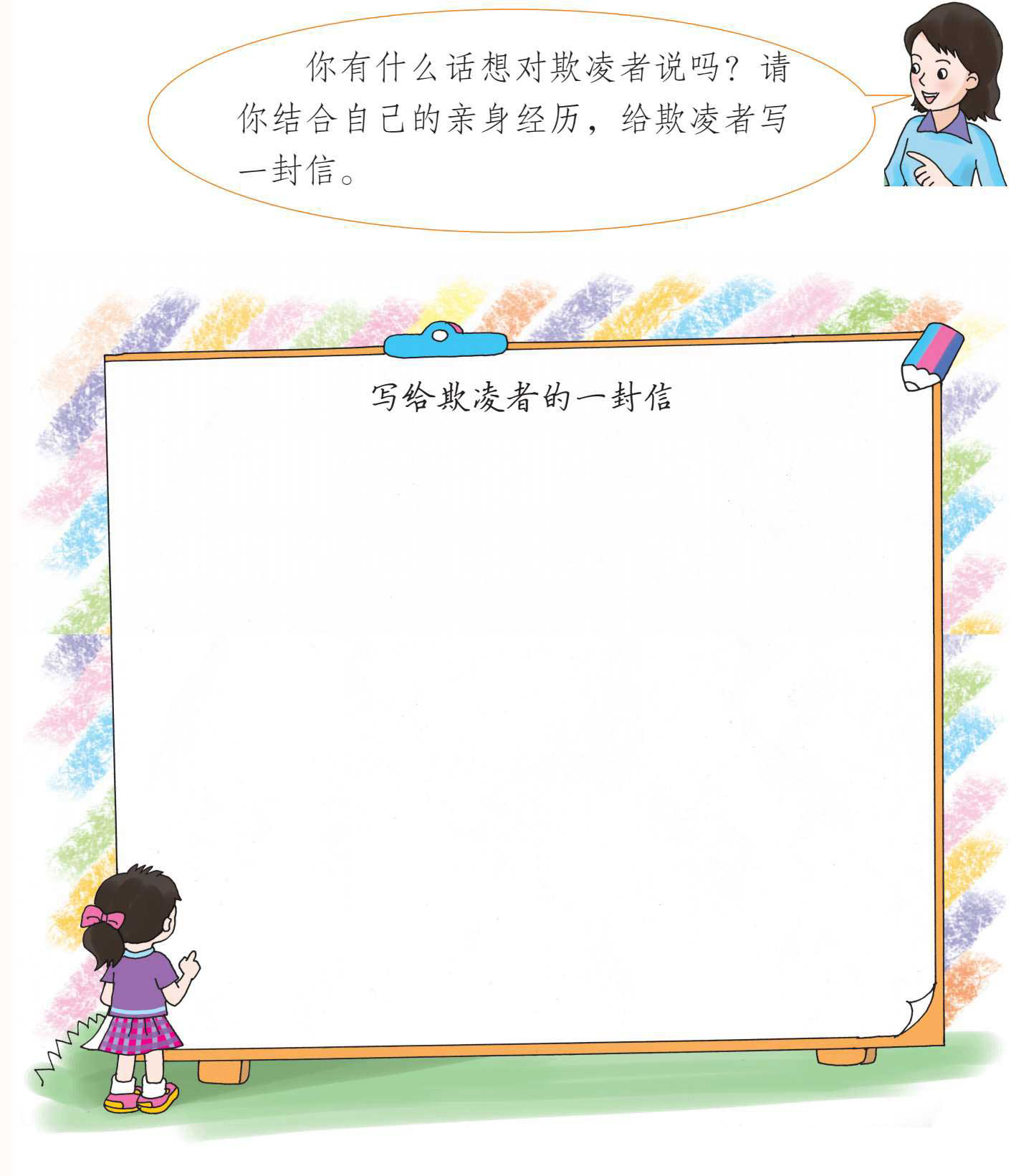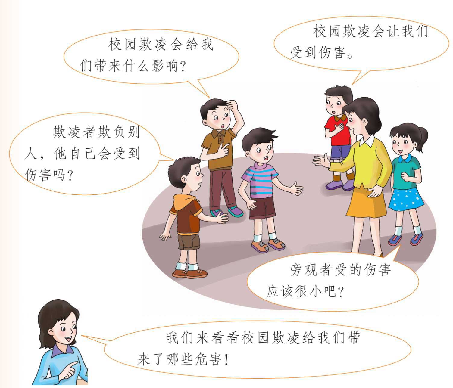 校园里有了欺凌,就破坏了同学间的关系、破坏了校园的温馨和宁静,更不利于我们的身心健康,给我们带来了很大的危害。我们渴望在和谐、安全的校园环境中愉快地学习,健康地成长。让我们一起努力,驱散笼罩在校园上空的黑暗!