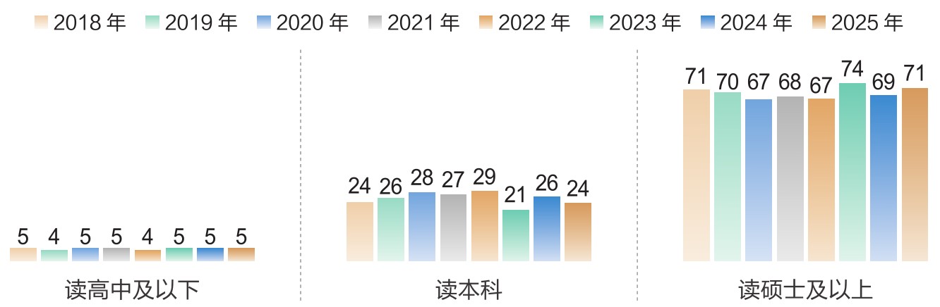 从2025年调研数据可以看出,自2018年以来,意向赴海外攻读硕士的人群占比一直居高不下,本科次之。2025年,硕博申请比例有所增加,高中及以下阶段低龄留学意向相对稳定。