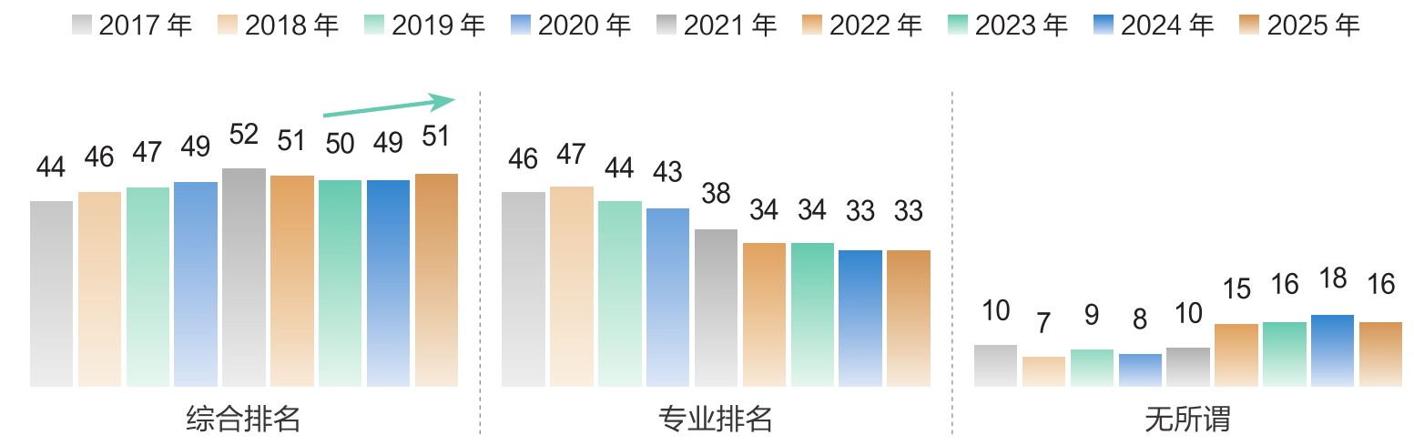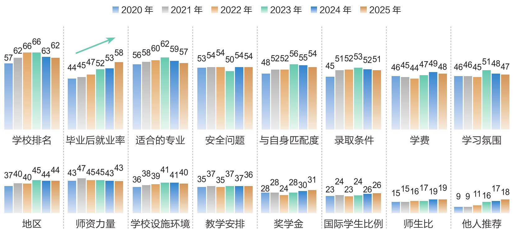 院校排名作为影响就业竞争力的关键因素,起着至关重要的作用。2025年,有半数意向人群更关注学校的综合排名,远超过对专业排名的关注程度。