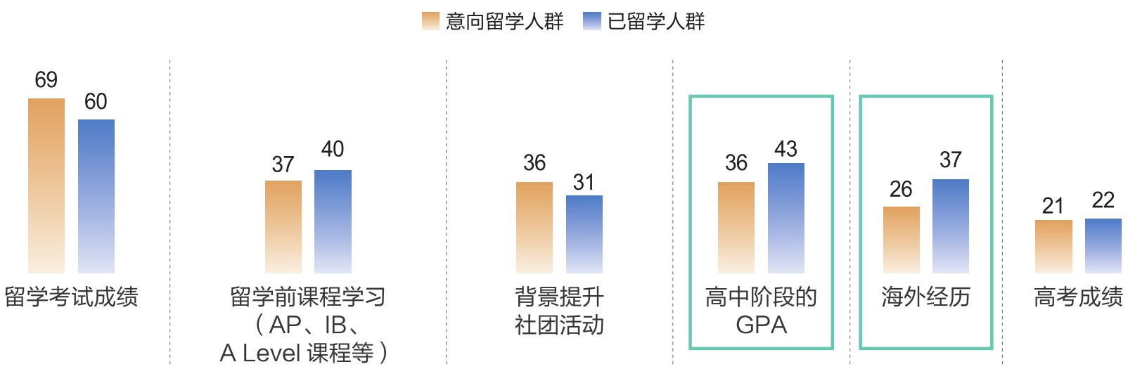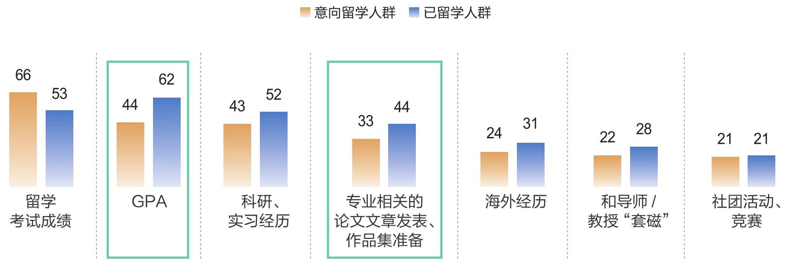 在留学申请上,不论是意向留学人群还是有留学经验的人群,都认同留学考试成绩非常重要,但在已留学人群眼中,还有很多被忽视的因素恰恰是留学申请过程中必不可少的。