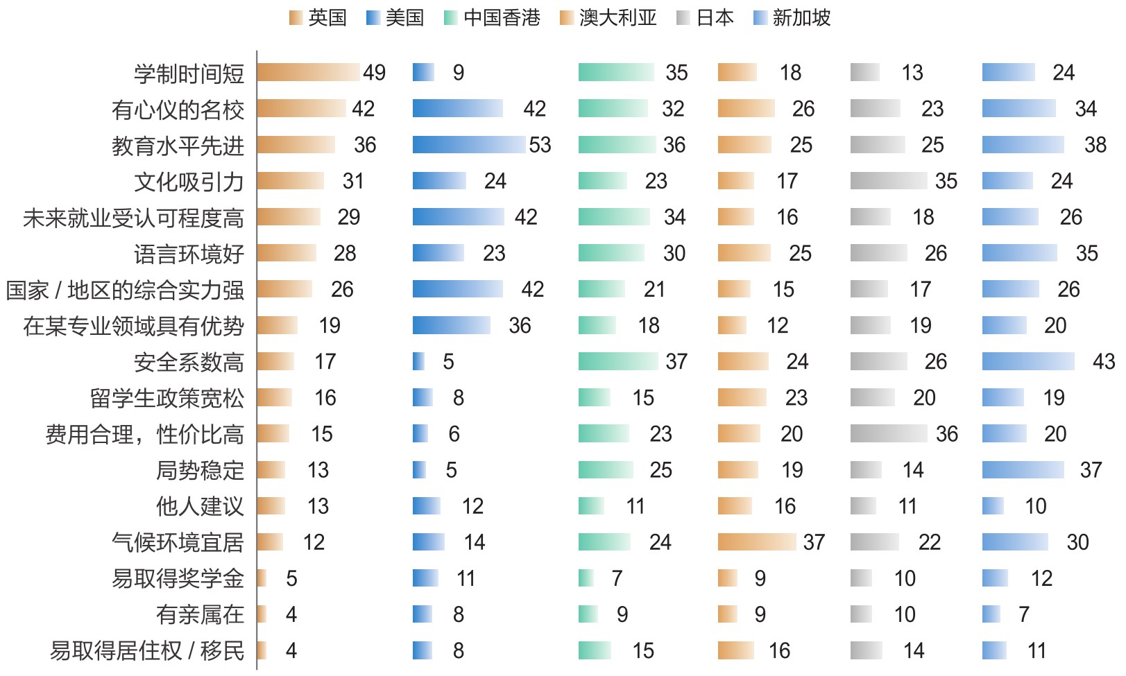 从调研数据可以看出,英国、美国凭借先进的教育水平、丰富的名校资源和较强的综合实力,吸引着莘莘学子前往求学。澳大利亚气候环境宜居,成为广大留学生选择其作为留学目的地的重要原因。
