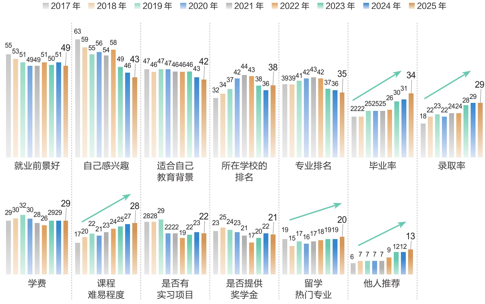 从连续六年的调研数据不难看出,意向留学人群非常重视院校的排名。除此之外,就业率和专业也是影响意向留学人群择校的关键因素。尤其是在当前全球经济存在较大不稳定性的情况下,意向留学人群对毕业后就业率的关注度持续攀升。