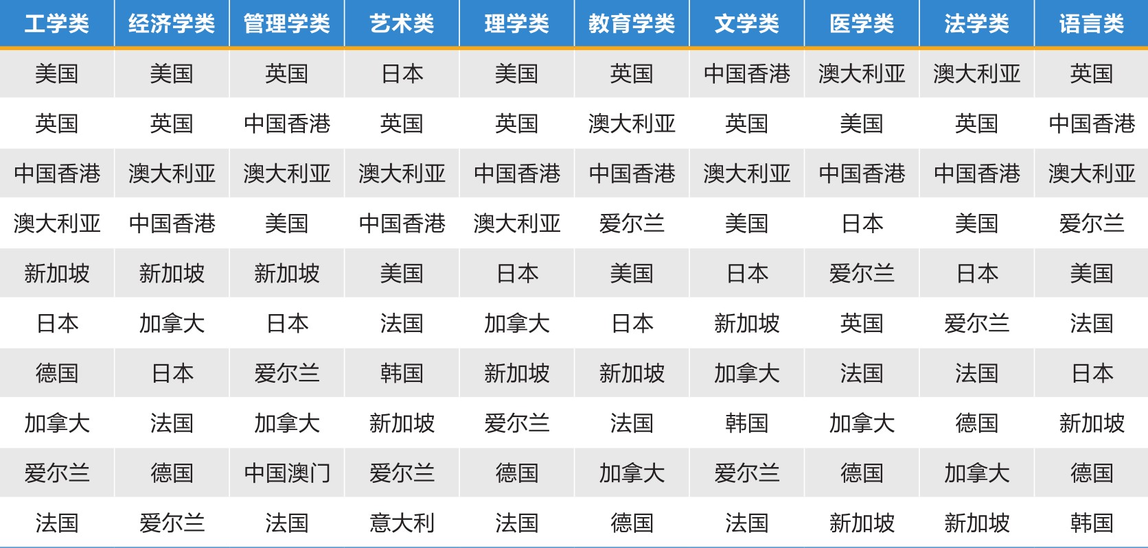 不同专业意向留学人群的意向国家/地区排名TOP10