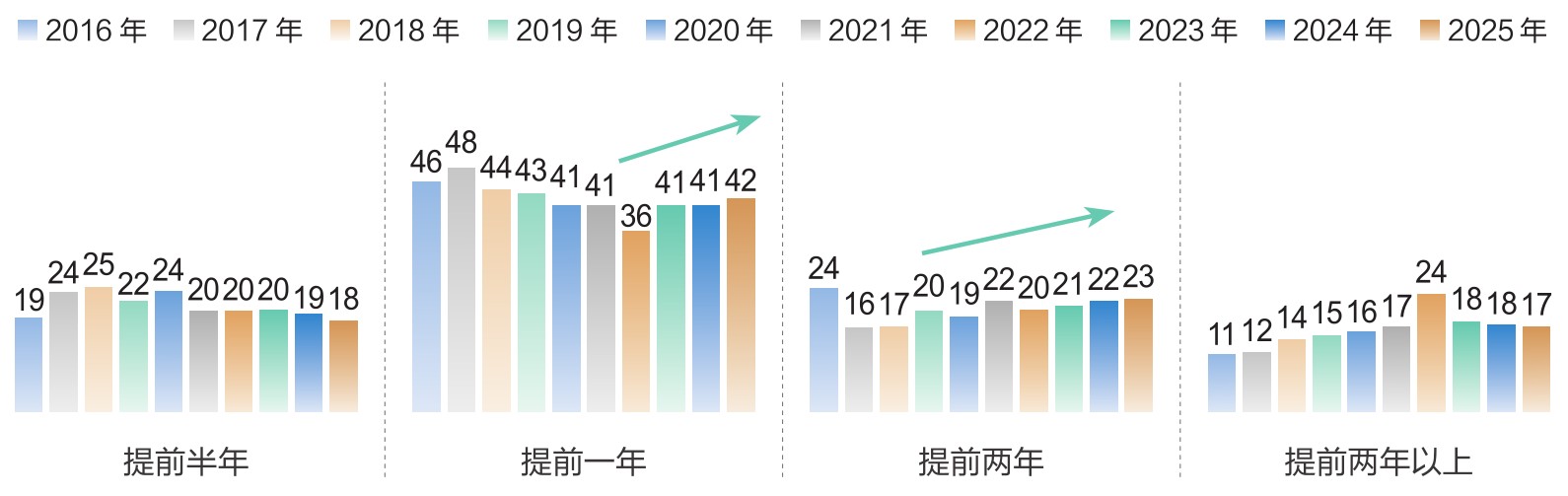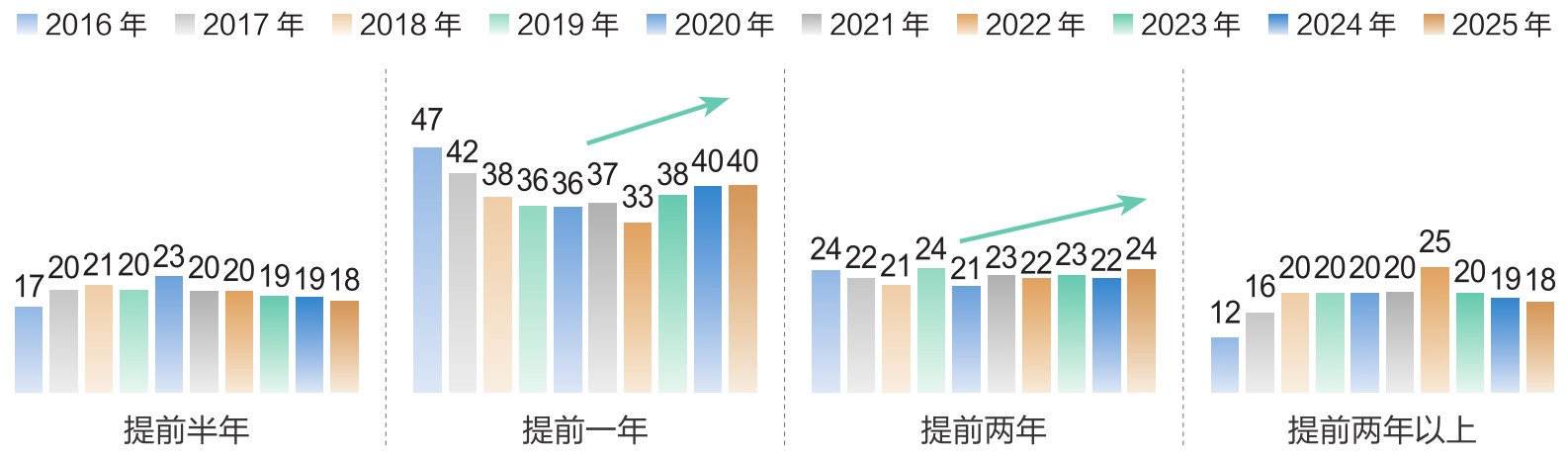 2025年调研数据显示,将近六成的学生提前一年到两年准备留学申请及相关考试,相关趋势也在不断增强。利用半年时间“突击”或者拉长战线提前两年以上开始准备的人数均呈下降趋势。由此可以看出,“早规划、早准备”的理念已经深入人心,留学筹备周期已趋于稳定。
