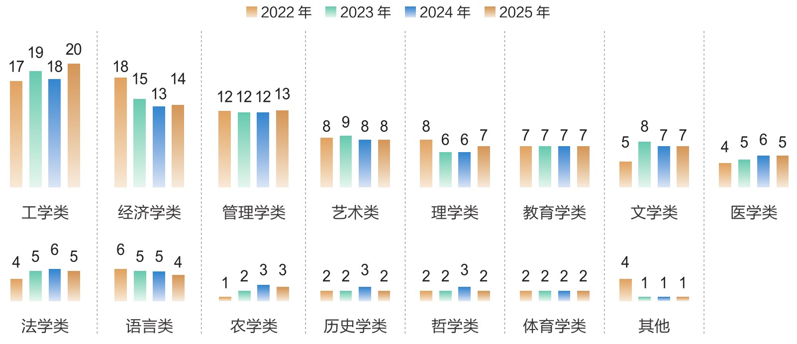 从近四年的调研数据可以看出,工学、经济学、管理学专业是意向留学人群最倾向就读专业的前三名,其次是艺术、理学、教育学等专业。相对而言,工学类专业倾向就读人数占比在2025年有小幅上涨,其他专业占比与去年基本持平。