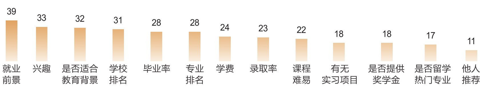 在国外读过本科的经验人士看来,学校及专业排名是其在选择本科院校时最为看重的;其次,也有半数以上留学生会关注学校地理位置及所在城市的安全系数;就业及实习机会也在今年被越来越多学生纳入考虑范围。