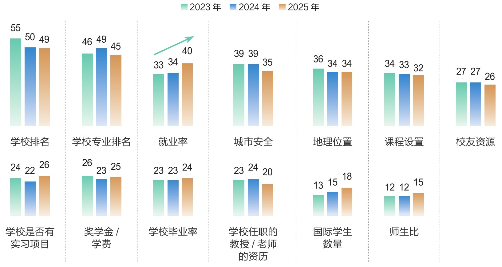 在国外读过研究生的经验人士更加务实,学校及专业排名、就业率是其在选择院校时的主要考虑因素,就业率及实习机会在2025年更被重视。
