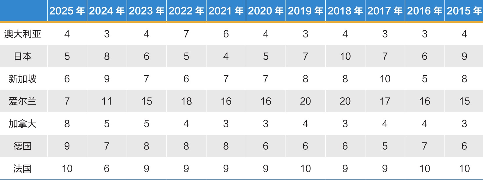 值得一提的是,爱尔兰在近几年越来越受留学群体的关注,2025年一跃升到第七名的位置。