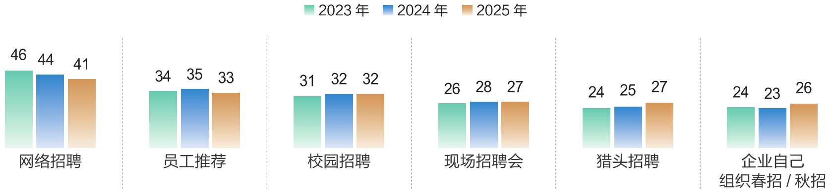 在2025年,网络招聘、内推、校园招聘依旧是企业吸纳人才的三大主要渠道。不过,由于近年来就业市场竞争激烈,猎头招聘及企业自己组织的春招/秋招的比重在上升,这一定程度上也表明企业在人才获取策略上正逐步加强专业性和针对性,以适应市场日益激烈的竞争和业务发展需求。