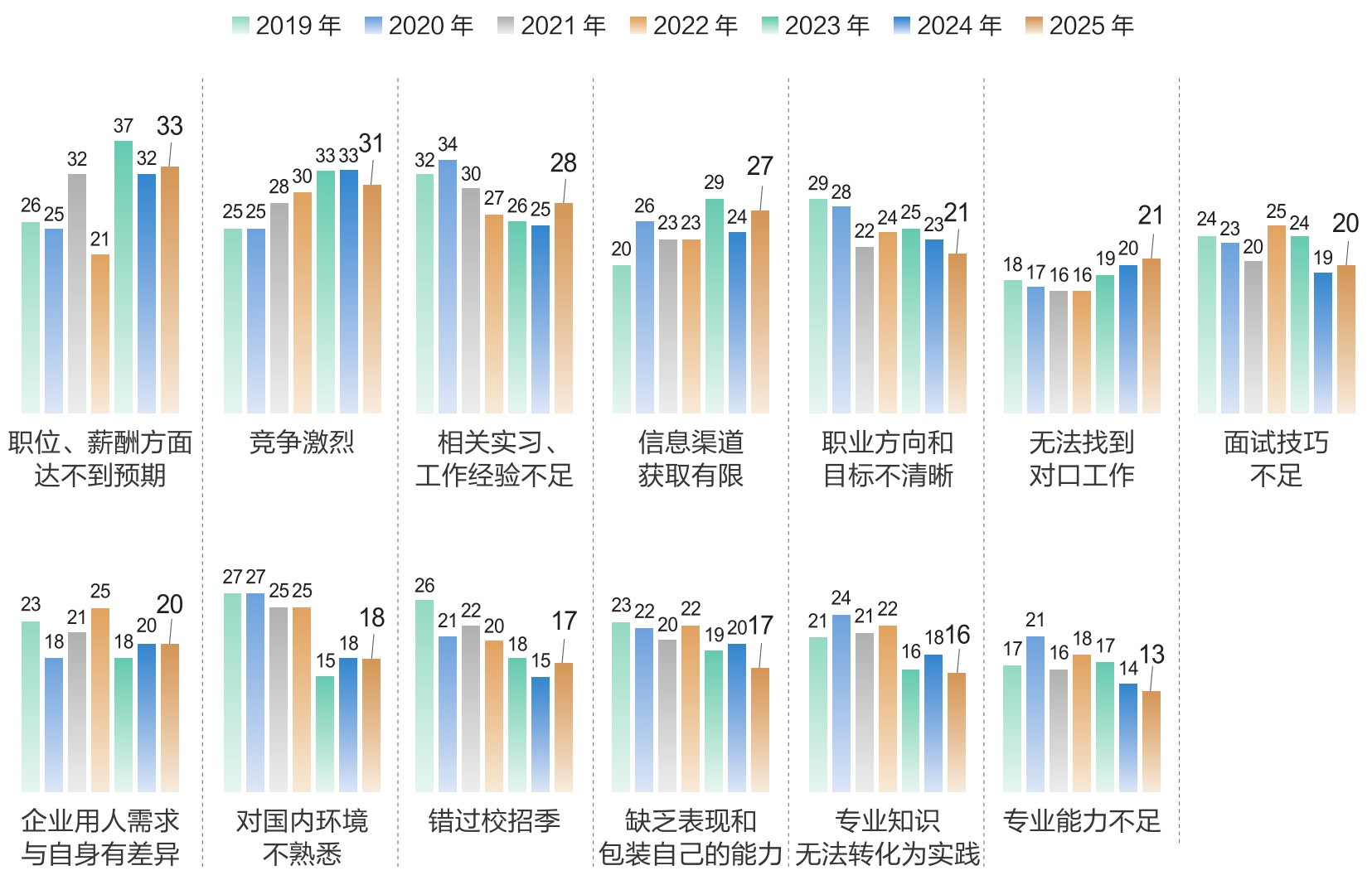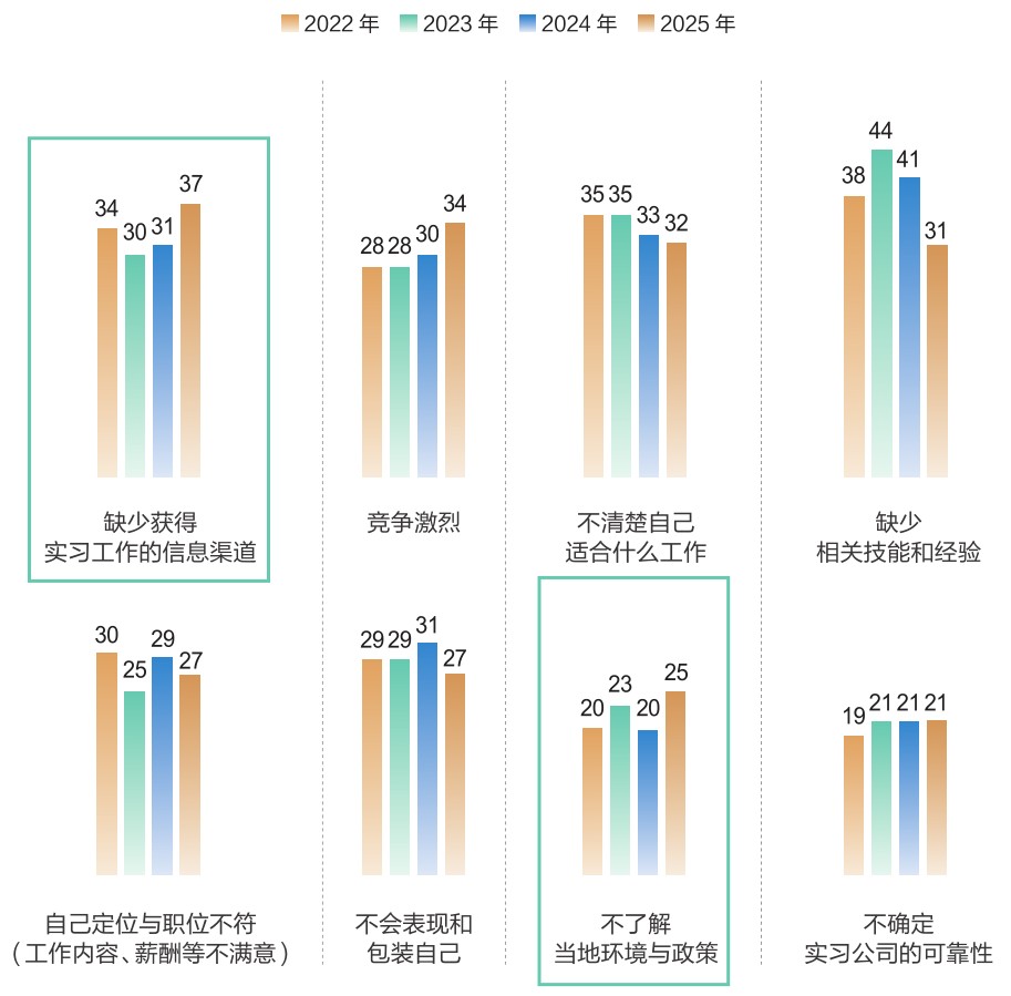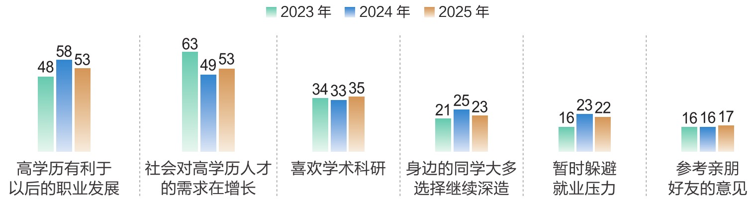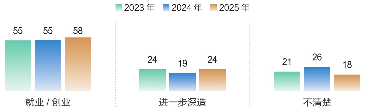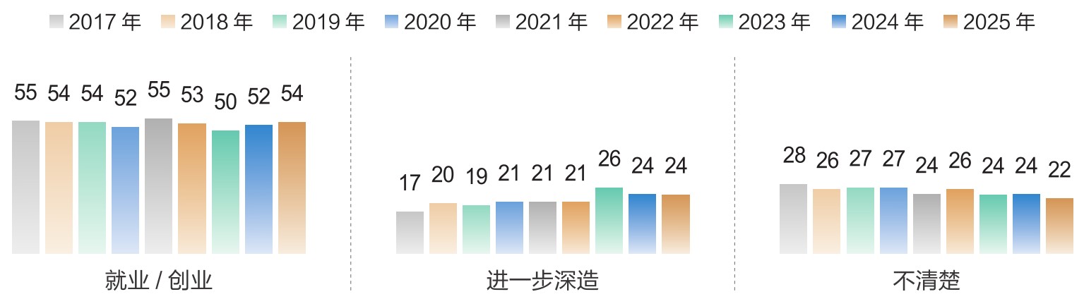 对比近三年的数据可以看到,2025年经济压力对留学生就业的影响已经开始减弱,他们对积累社会经验的需求更加强烈。此外,在这部分留学生眼中,学历或学术水平的提高对职业道路发展的帮助有限,他们更倾向于尽早进入到职场,在实际的工作中提升自身能力。