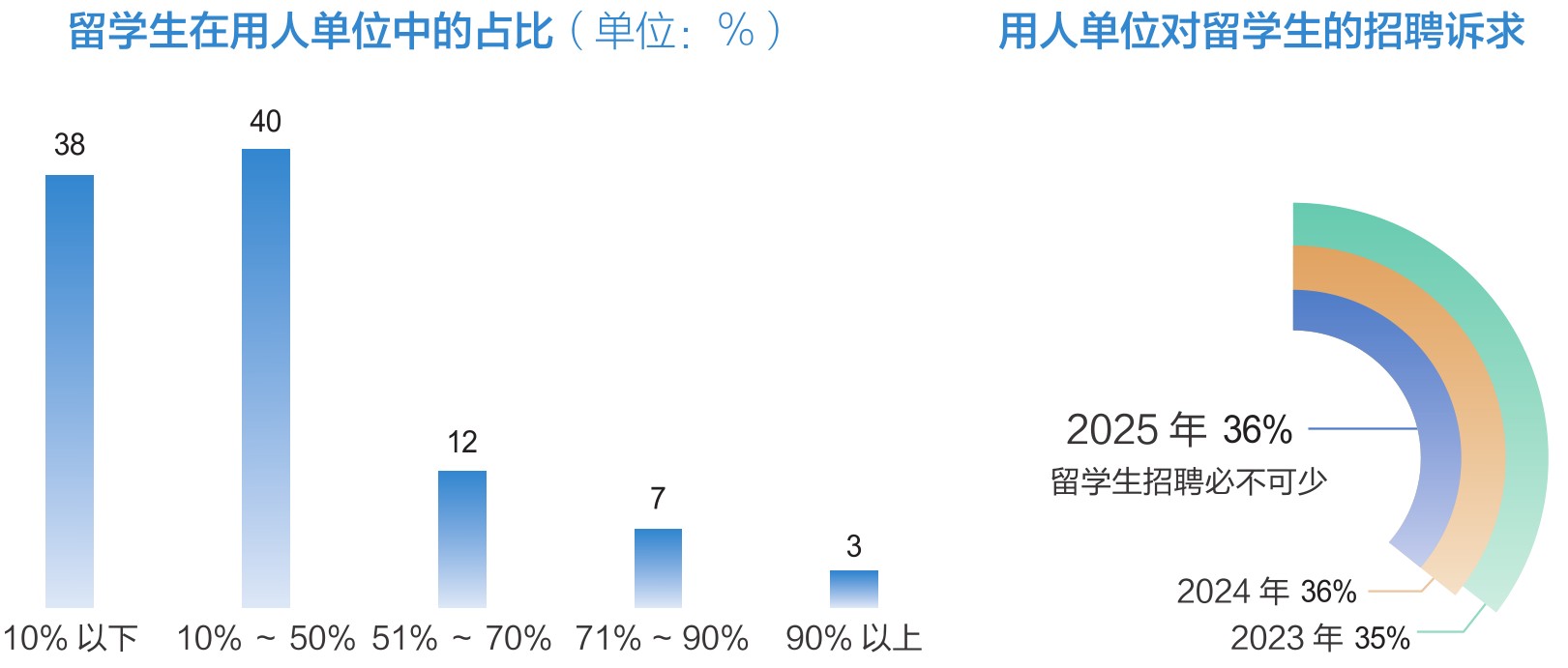 在2025年,超六成用人单位表示留学生在员工占比中超过10%,有超过两成用人单位表示目前在职员工中,留学生人群超过半数。可见当下留学生群体已经开始在职场上逐渐崭露头角。