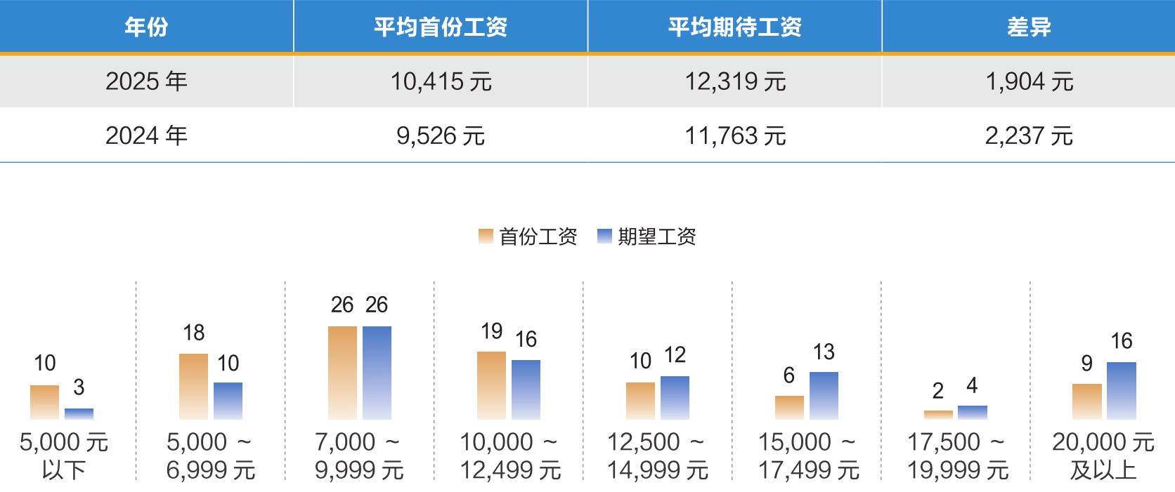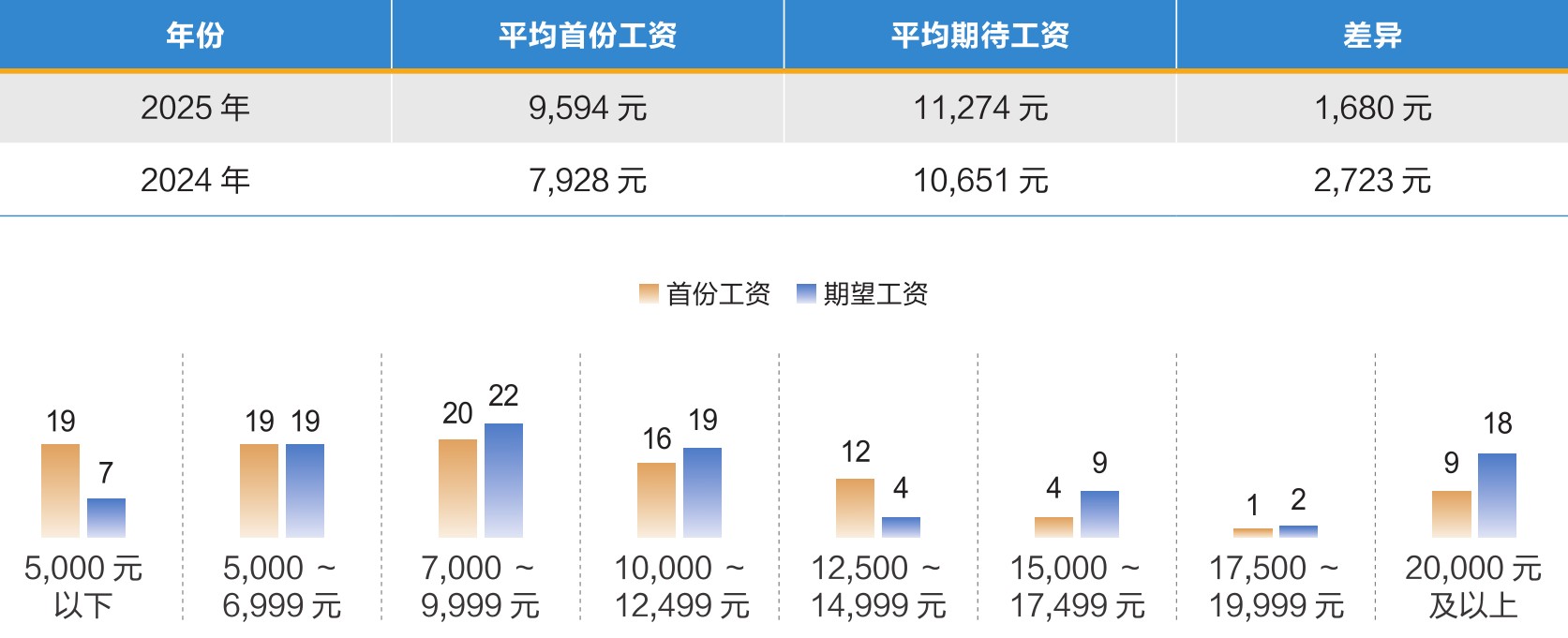 此外,无论是在期望层面还是现实层面,均反映出了学历与收益之间的正比例关系,研究生的预期与现实收益均高于本科留学生。值得注意的是,与2024年相比,留学生的期待工资与实际首份工资之前的差距有所减小,这也反映出当下留学生对工资收益的预期逐渐回归现实。