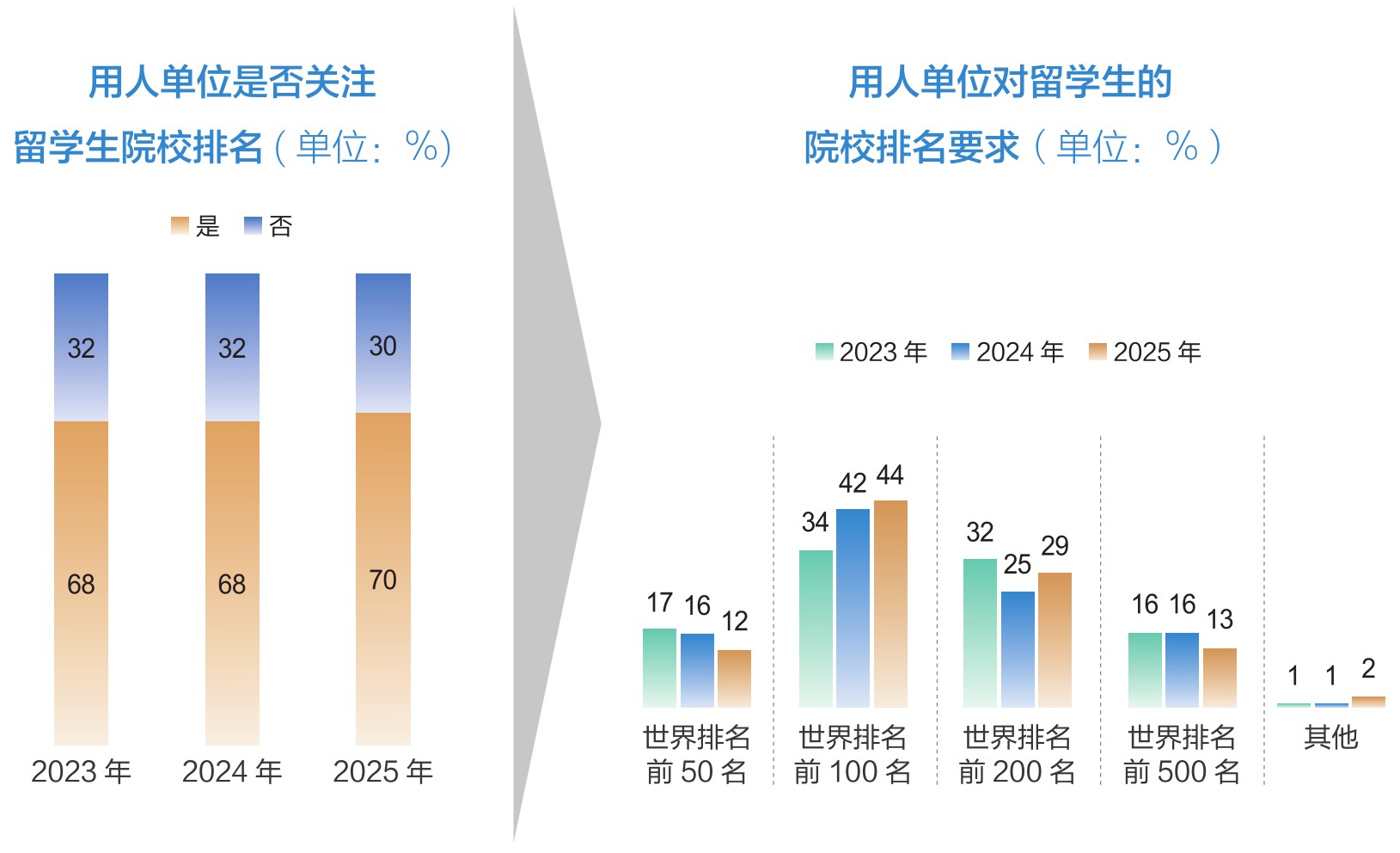 近年来,用人单位愈发看重留学生所在的海外高校的全球排名。对于对国际留学教育环境不甚了解的企业来说,世界排名是最易量化的指标,也最易被接受和推广。2025年,半数以上的企业要求留学生的就读院校世界排名在前100名。