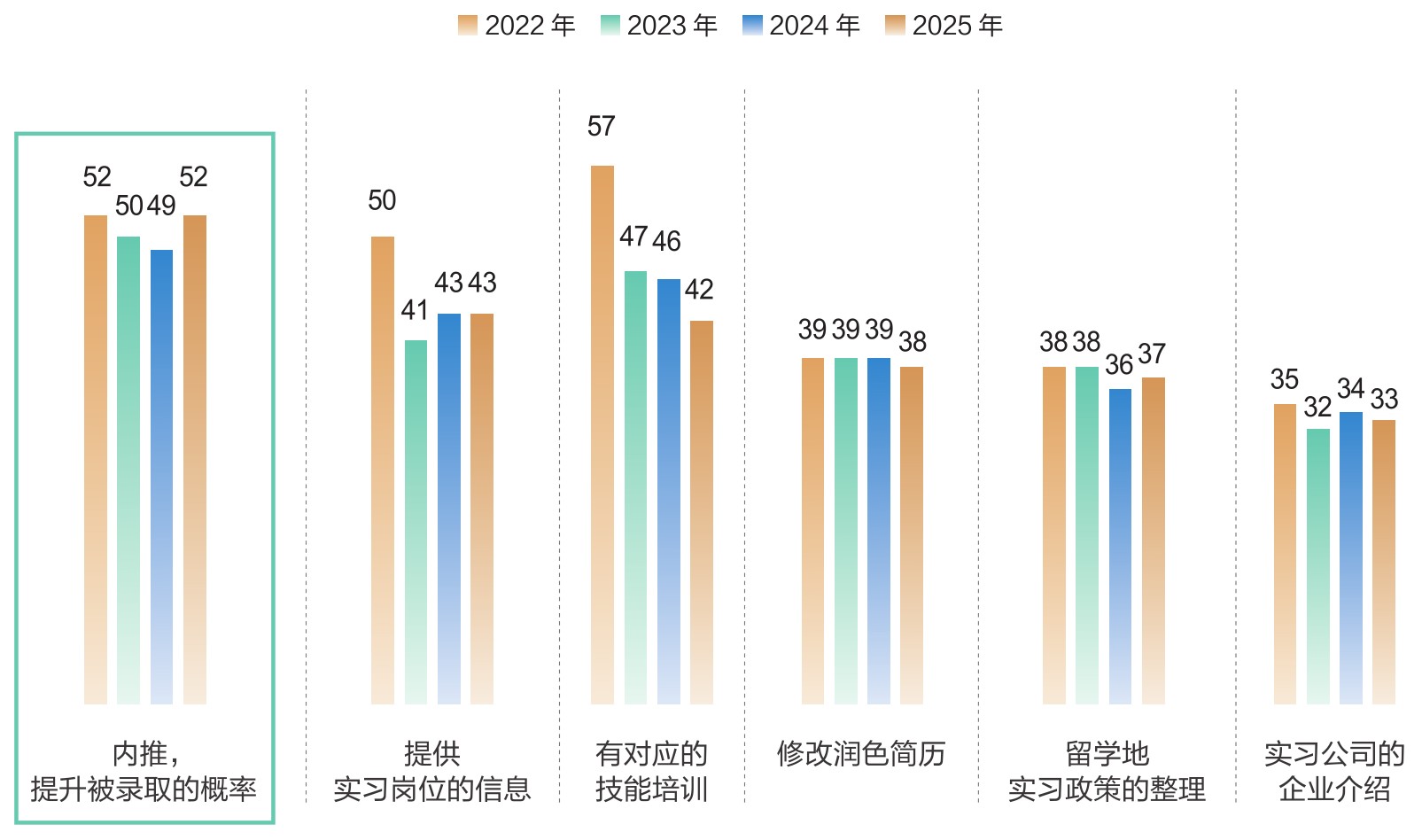 2025年,有实习经历的留学生占比触底反弹,一扫此前因外部环境造成的实习受阻的阴霾,占比达54%,为历史新高。同时,数据背后也反映出当前留学经验人群对社会工作经验的高度重视。