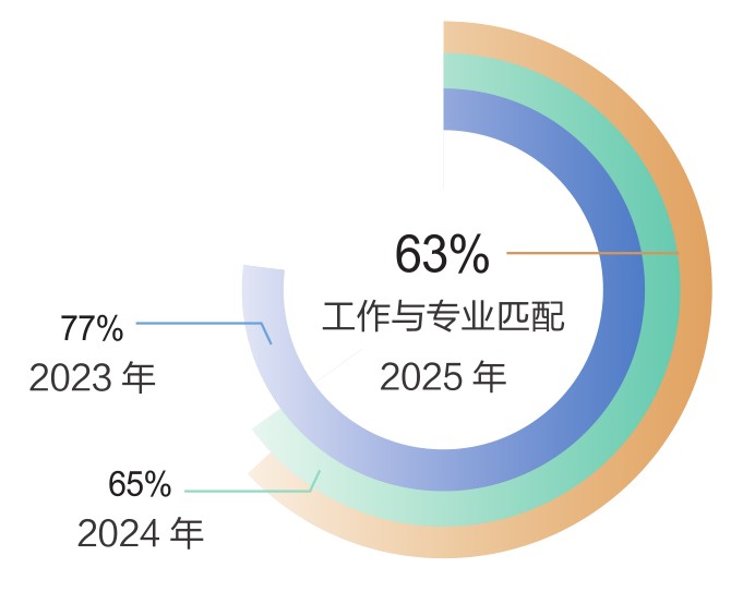 从行业选择来看,金融、教育、计算机是当前意向留学人群的主要预期工作领域。与此同时,受当下就业竞争压力影响,留学毕业生的工作岗位与专业的匹配度持续下降,“学非所用”呈常态化趋势。