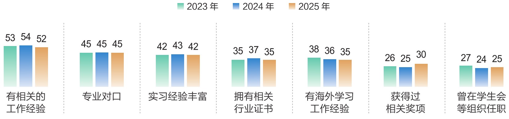 除了院校背景外,用人单位还特别关注与岗位需求契合度相关的因素,主要包括工作经验、专业对口及实习经历等因素。值得注意的是,当前用人单位并不会特别关注海外的工作或实习经历。无论在国内还是国外,留学生只要具备与岗位直接相关的工作或实习经历,就会在应聘市场中具备更强的竞争力。