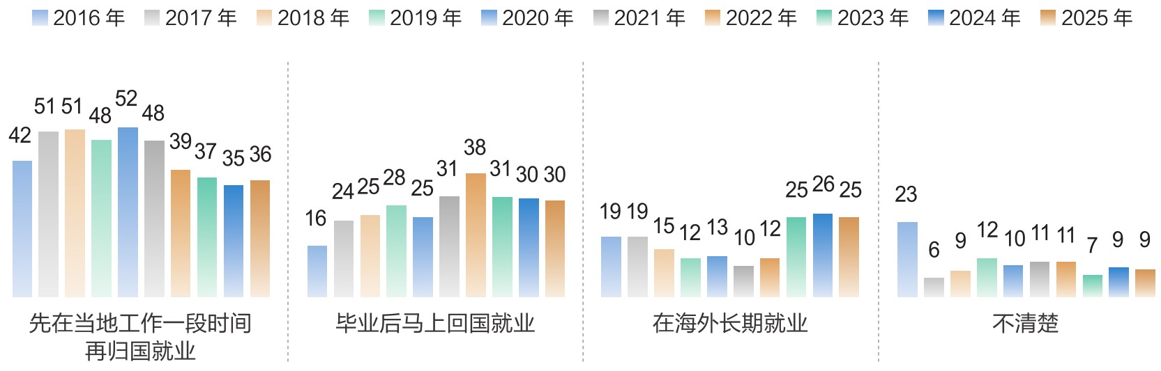 根据2025年调研数据,计划“毕业后马上回国就业”的人群占比保持稳定,选择“先在当地工作一段时间再归国就业”的人群持续保持主流。值得注意的是,伴随着国际环境的恢复和开放,越来越多的意向留学人群期望能在海外就业,积累工作经验。总体而言,留学生回国周期更长。