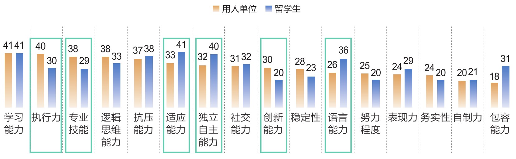 与此同时,企业同样非常看重员工的执行力和专业技能,这与留学生的自评存在较大差异。留学生认为自己的适应能力和独立自主能力方面的优势在用人单位看来并不是招聘时的重点考虑因素。这意味着,留学生还需要关注并提升自己的执行力和专业技能,以适应快速变化的市场环境和企业的实际需求。